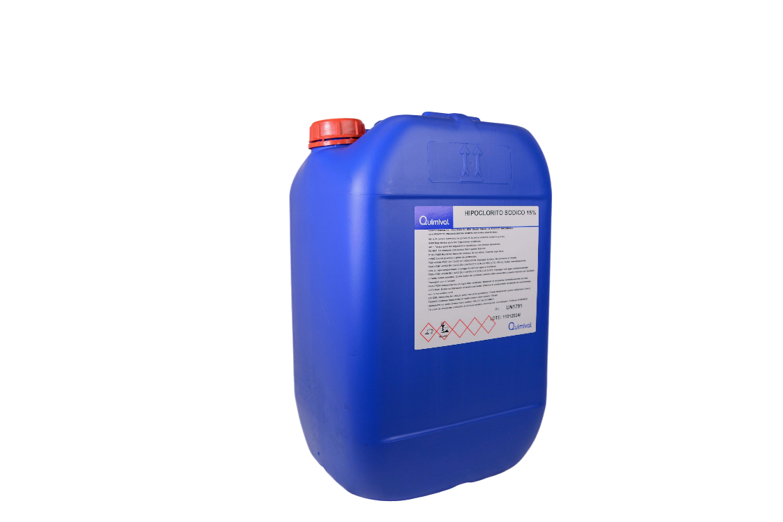 Disolución acuosa al 15% de hipoclorito de sodio NaOCl (lejía, Agua de Javel, Hipoclorito de sosa), de color amarillo-verdoso, transparente, ligeramente alcalino y con olor a cloro. Formatos: 5L, 28L, 50L.
